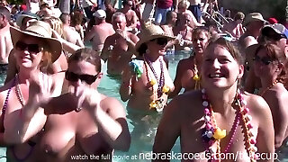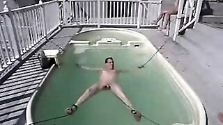 A blonde pushed the fellow into the pool so that he became wet, because her cunny was already dripping