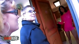 Inexperienced black-haired masseuse Lucie Q gets seduces by old couple for FFM session