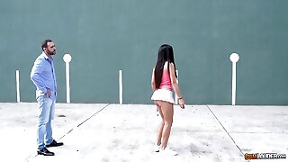 Bashing tennis player with big fun bags agrees to rough pounding at the field