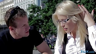 Kinky straight haired blonde damsel in nerdy glasses gets poked doggy