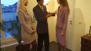 Two ample lesbian chicks allow the thin guy to help them out