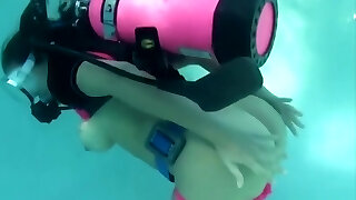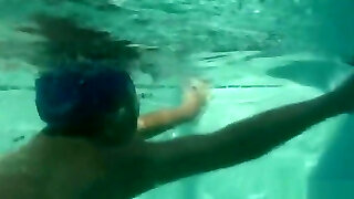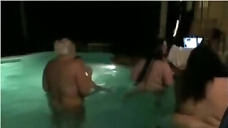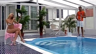 A blonde pushed the fellow into the pool so that he became wet, because her cunny was already dripping